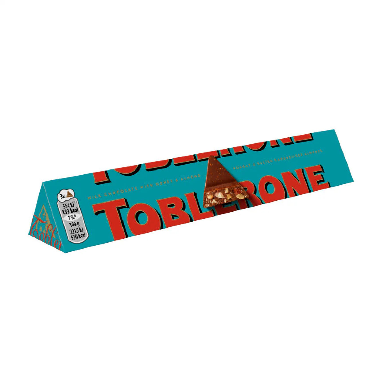 Different from the other toblerone (with its blue wrapping), this crunchy almonds chocolate is a crispy mixture of many ingredients. You'll find salted caramelized almonds, nougat, honey and almonds combined with superfine swiss milk chocolate.